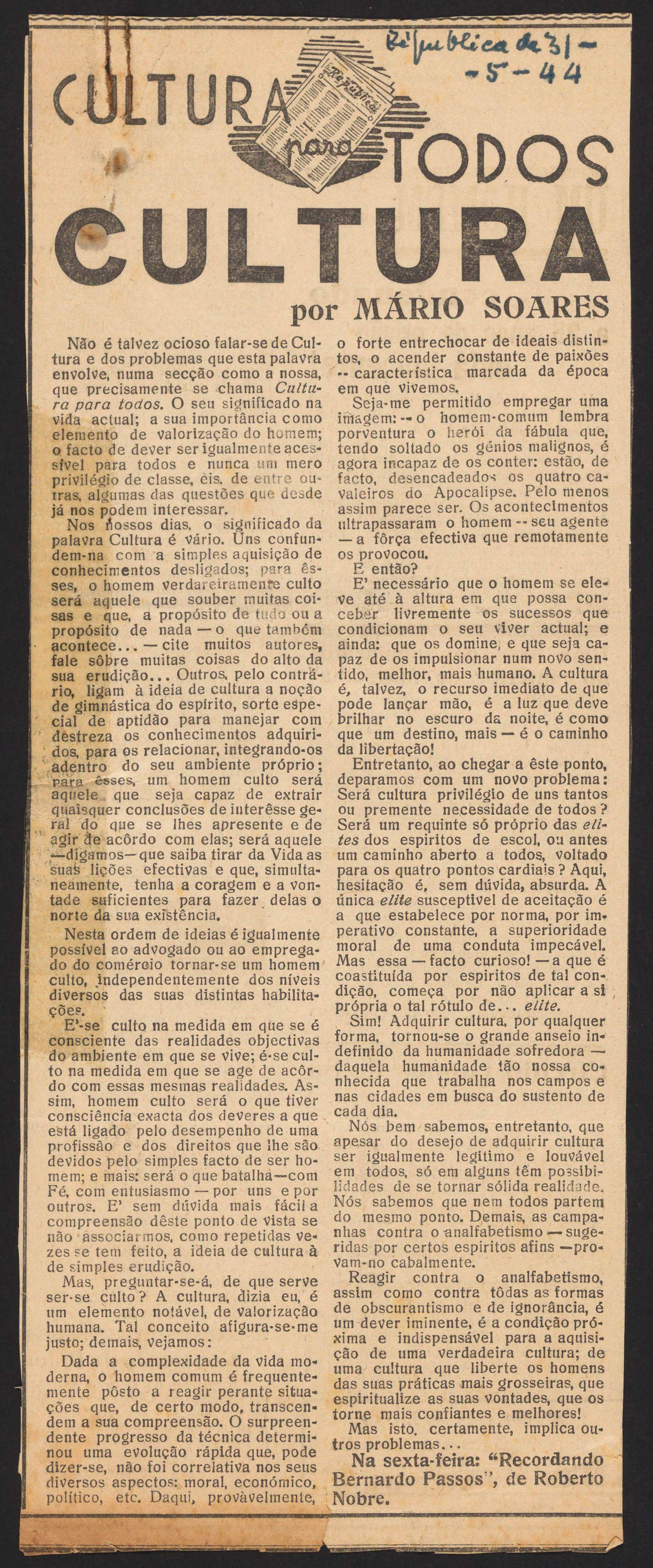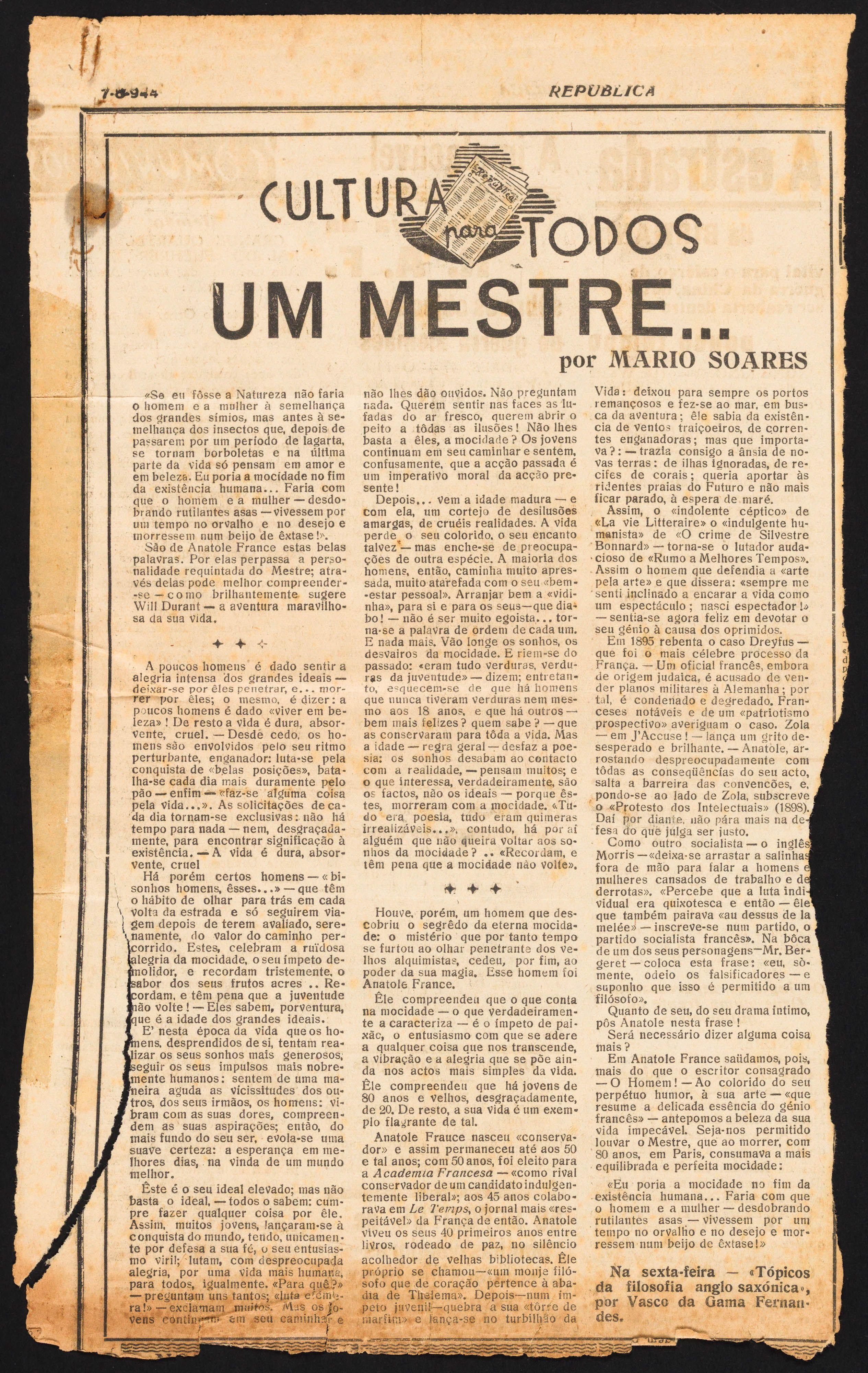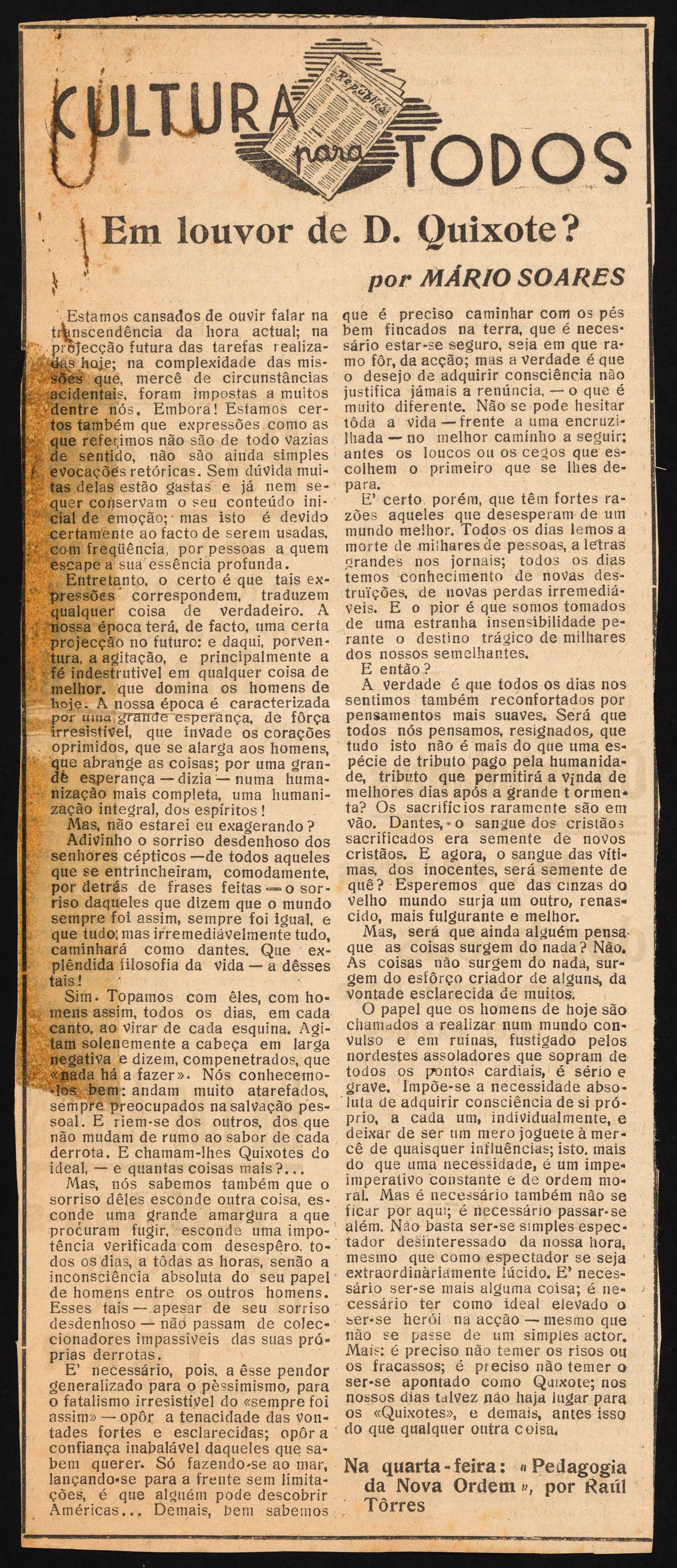 Publishes his first articles in the República daily newspaper, under a column titled “Culture for All” ("Cultura para Todos")