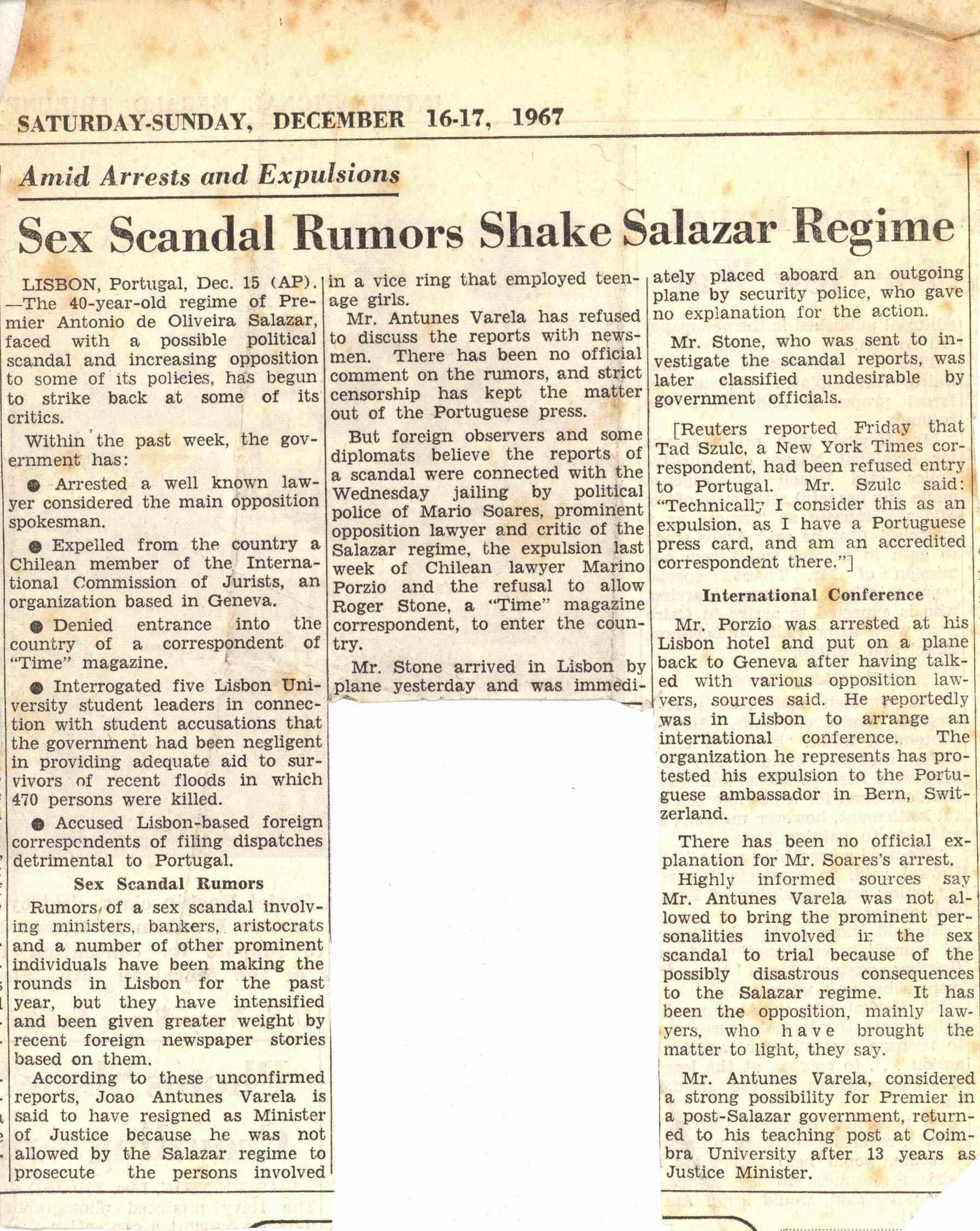 The “Ballet Rose” case is reported by the Sunday Telegraph. Soares is arrested in his office at Rua do Ouro, charged with having provided “false and difamatory information to the international press, which could damage the good name of Portugal”. The arrest sparks a wave of international protests.