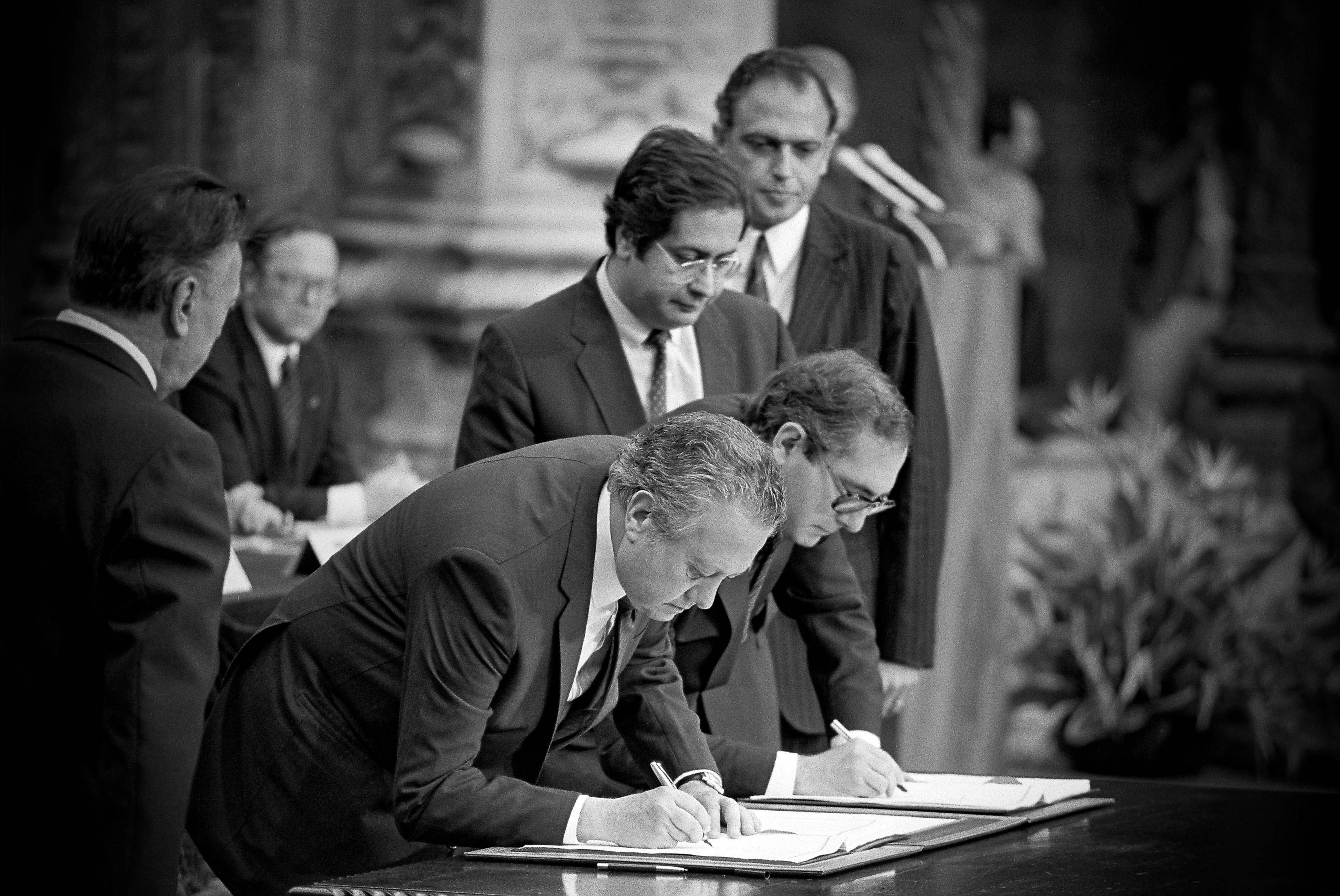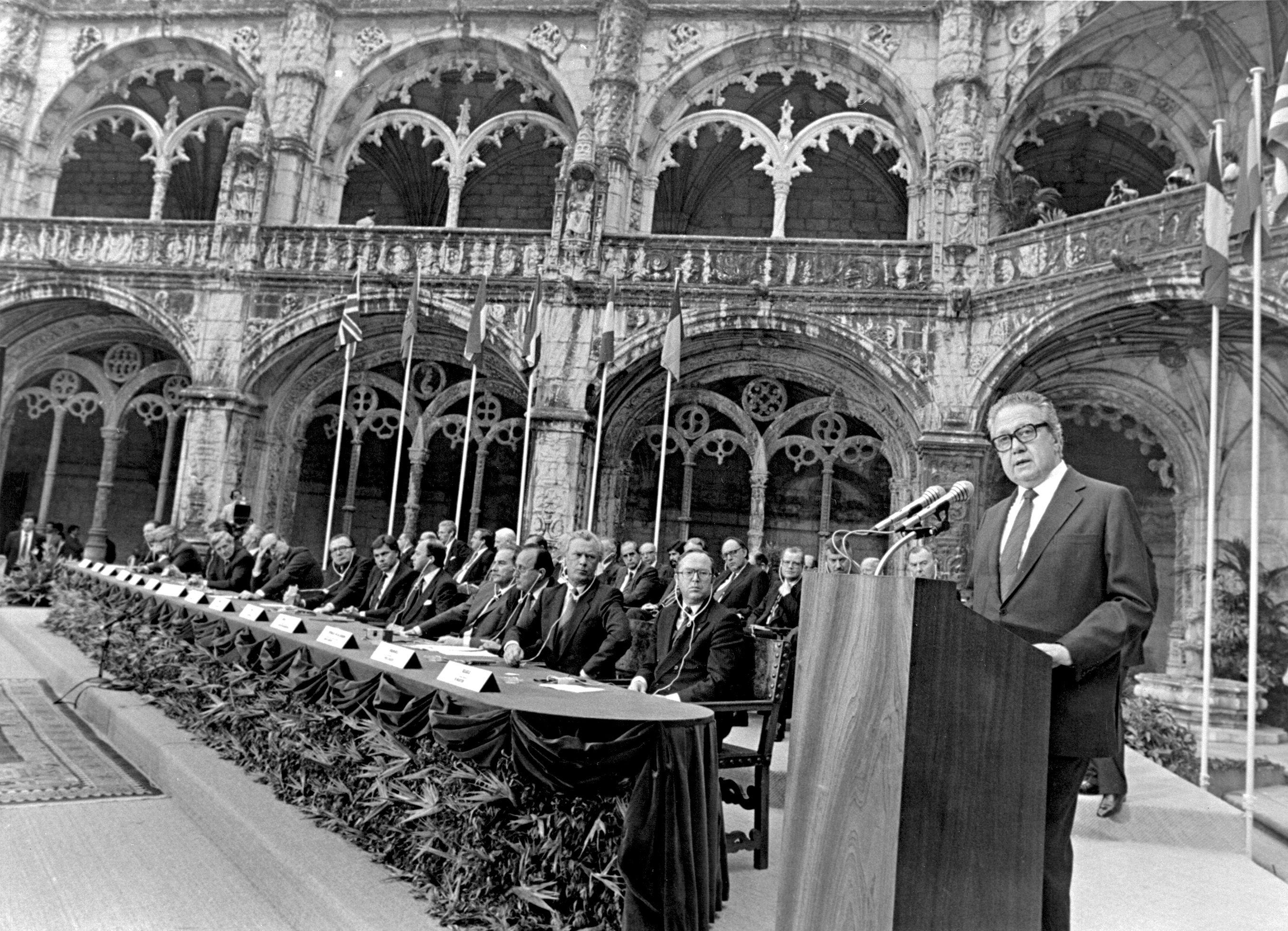 Official signing ceremony of Portugal’s Treaty of Accession to the EEC, at the Jerónimos Monastery, which will come into force on January 1st, 1986. Mário Soares, Bettino Craxi, Giulio Andreotti and Jacques Delors deliver speeches.