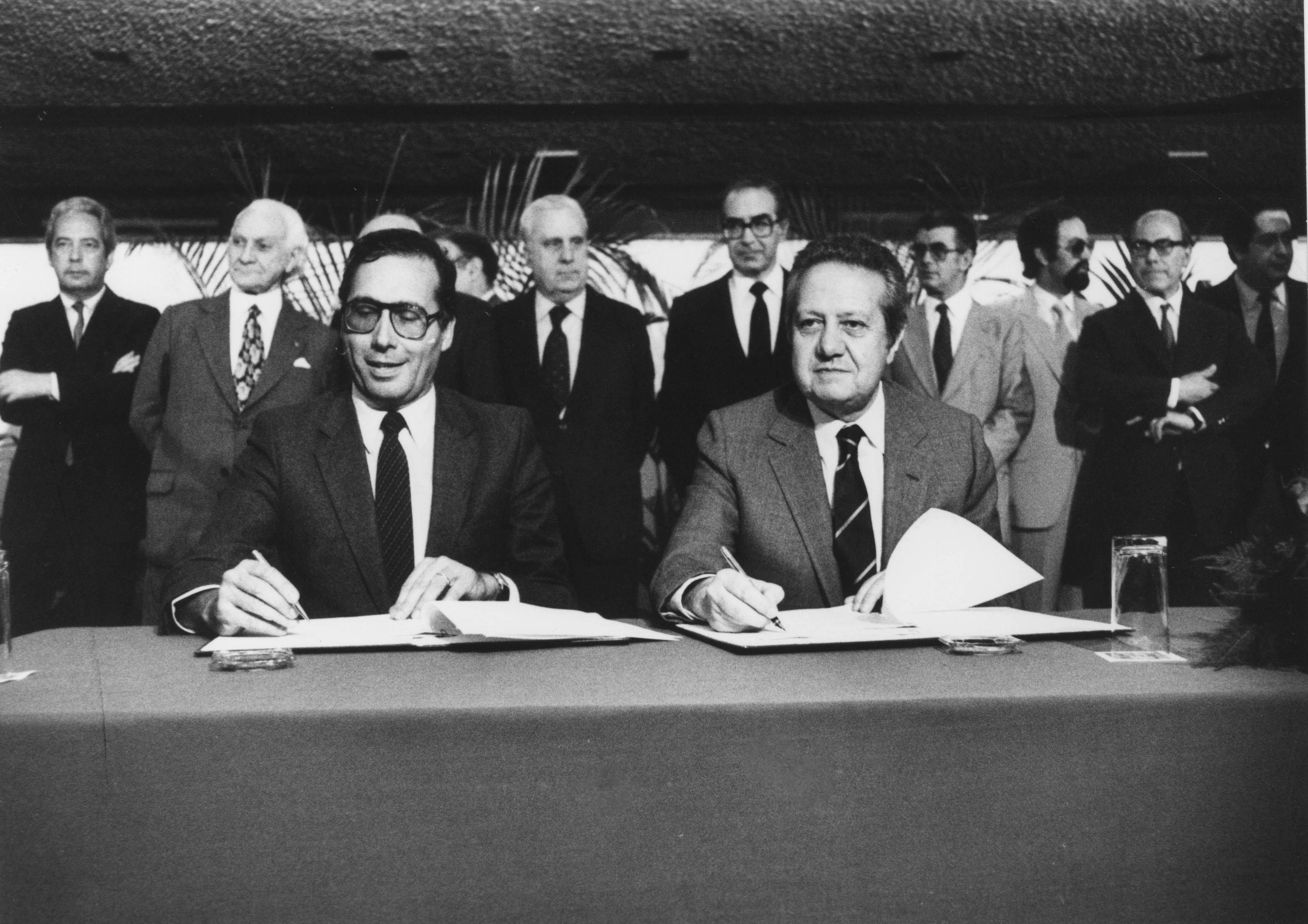 Mário Soares and Carlos Alberto Mota Pinto, the PSD (Social Democratic Party) leader, sign a political, parliamentary and governmental agreement between both their parties.
