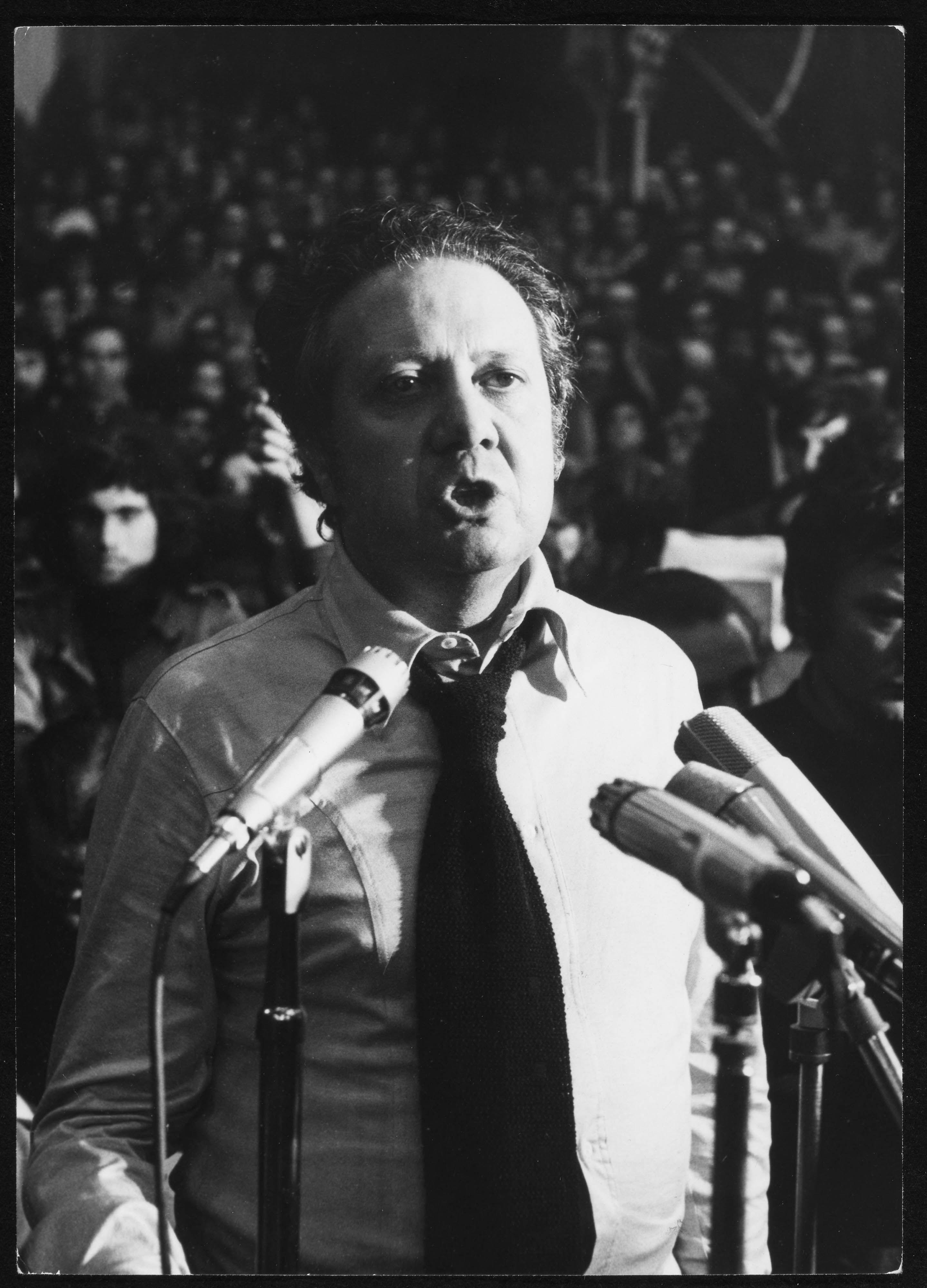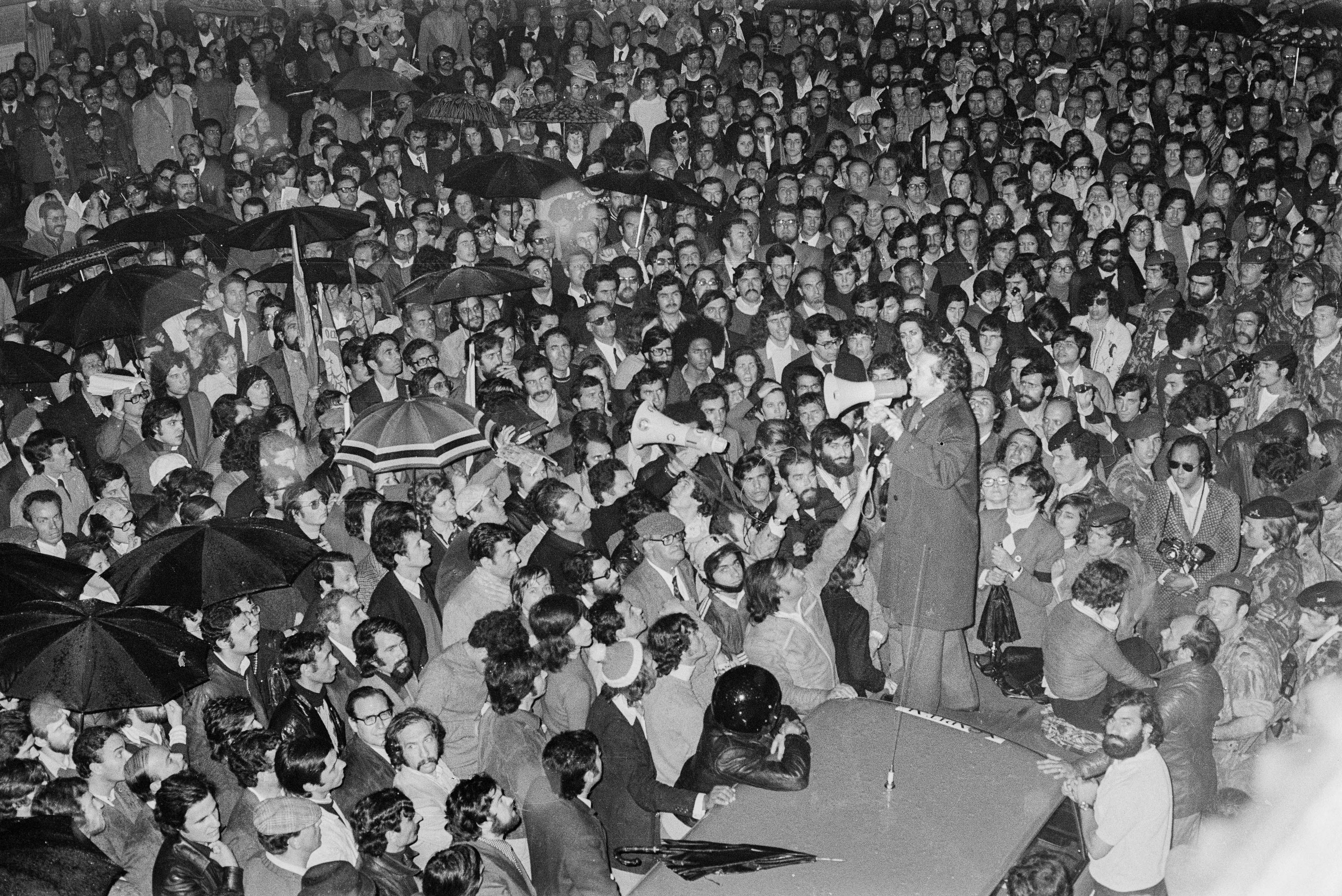 At a large rally organized by the PS at Fonte Luminosa, in Lisbon, Mário Soares calls for the resignation of the Prime Minister, Vasco Gonçalves.