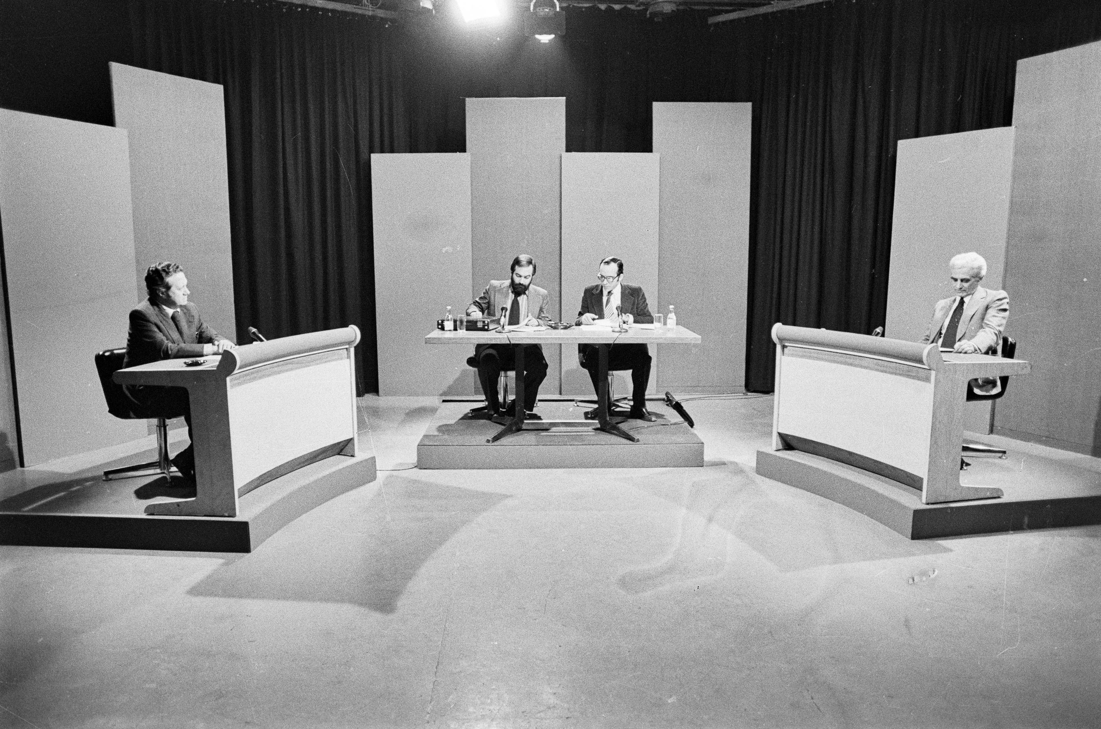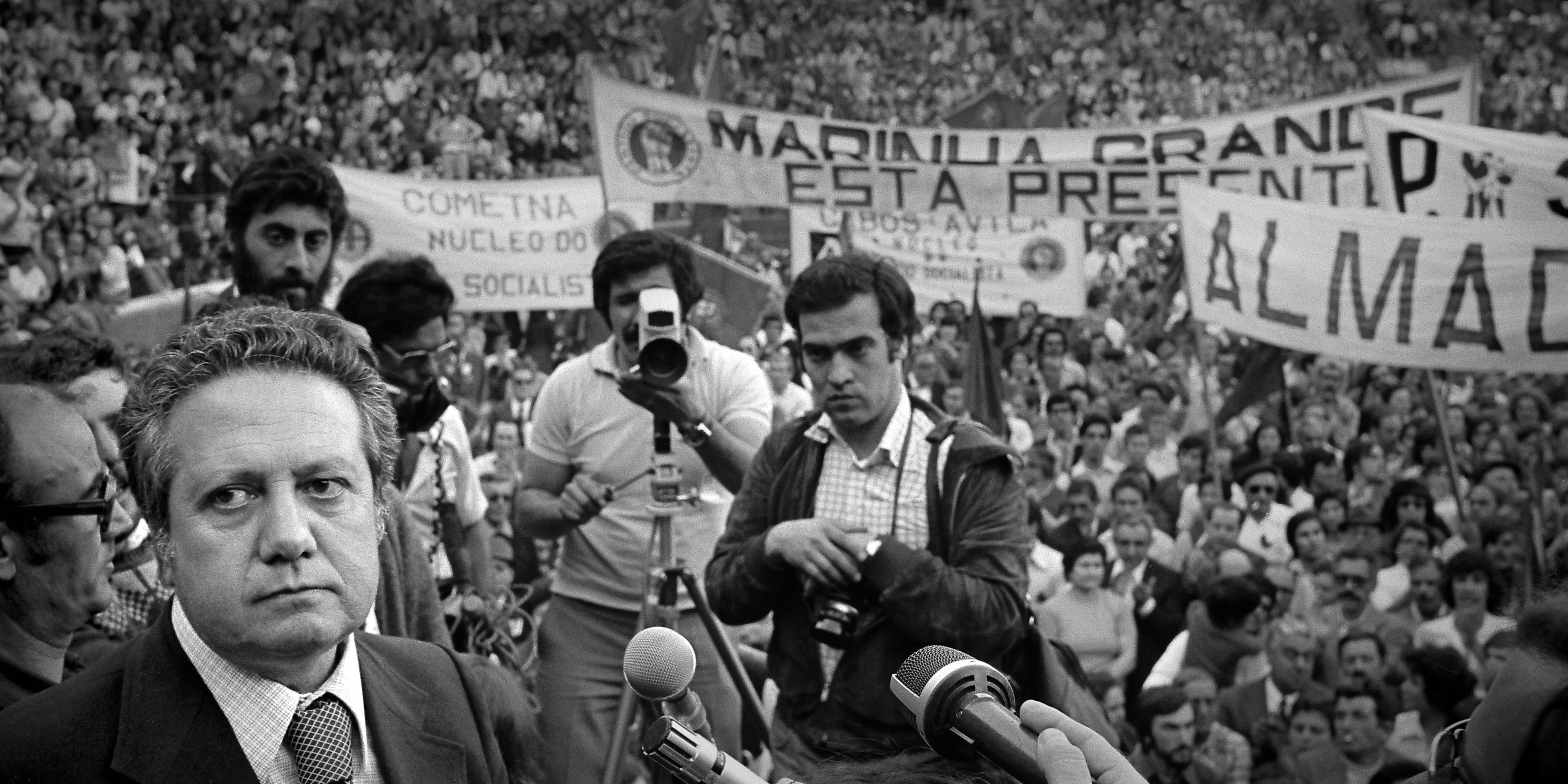 Mário Soares and the leader of the PCP, Álvaro Cunhal, debate in front of the RTP (Portuguese Radio-Television) cameras; their conflicting positions on the political situation and visions for the country become evident.